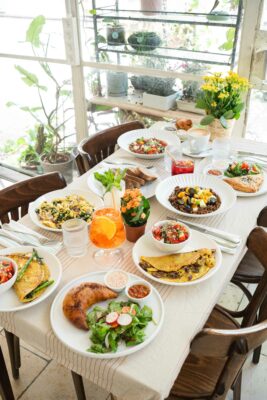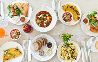 אומלט, סלט לבחירה, לחמים, לאבנה, פטה, סקורדליה, טחינה, זיתים וריבה